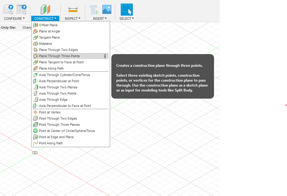 - Create a new construction plane that aligns with the feature you want to cut through. You can use options like ‘Plane Through Three Points’ or ‘Plane Tangent to Face at Point’.